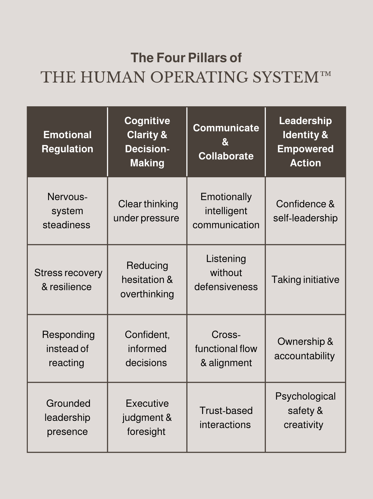 The Human Operating System represents the emotional, behavioral, and communication patterns that drive leadership performance and organizational outcomes. Strengthening this system enables leaders to think clearly, communicate effectively, collaborate across functions, and act with confidence.